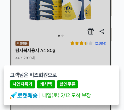 쿠팡은 일반 개인회원 외에도 사업자 전용 B2B 상품을 제공하고 있습니다.