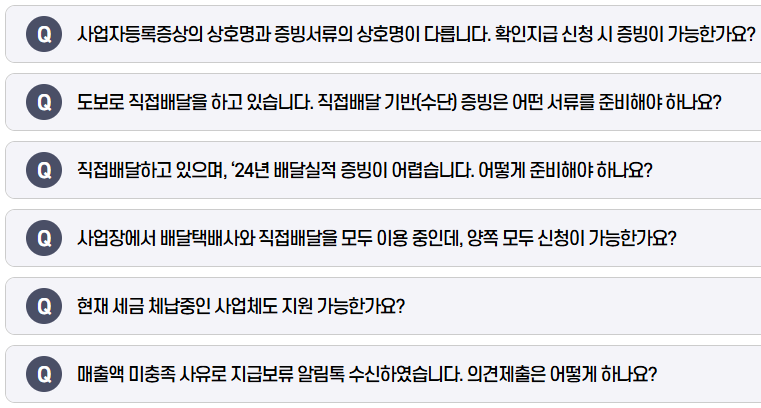 - 배달앱 입점(배달의민족 요기요 쿠팡이츠 등) 또는 택배 발송 내역이 있는 업체